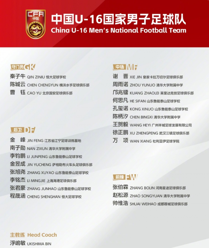 国少队23人完整名单如下:门将: 1-秦子牛、12-陈城云、23-曹钰后卫: 2-金峰、4-南子勋、5-李钧鹏、6-金昱成、8-张旭尧、13-李铭杰、14-张君豪、22-程晟涵中场: 3-谢晋、7-周雨诺、10-邝兆镭、11-何思凡、15-孔玺诺、16-陈炳汐、17-王贺毅、18-徐正鹏、19-万项前锋: 9-张伯霖、20-赵松源、21-帅惟浩